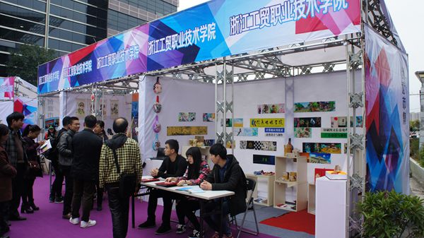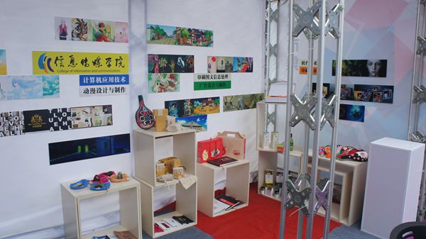 抵达会展中心后,老师和志愿者同学们“别有用心”地摆出一件件精美地作品,其中包含有瓯窑工作室、瓯绣工作室、瓯塑工作室、活字印刷工作室等区域文化研究中心的作品,以及信息传媒公司的计算机应用技术——动漫设计与制作,印刷图文信息处理——广告设计与制作,还有艺术设计专业、工业设计专业、鞋类设计专业、眼镜设计专业等等公司同学的设计作品。出展地作品都十分精美细致,透露出设计者和制作者的别出心裁,也招来了不少参观者的上前欣赏与指点称赞。
