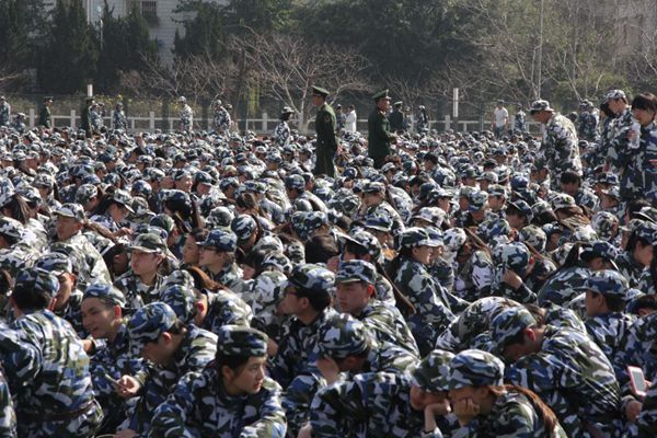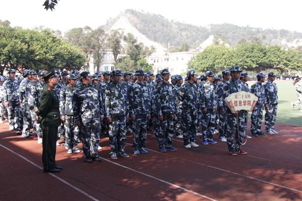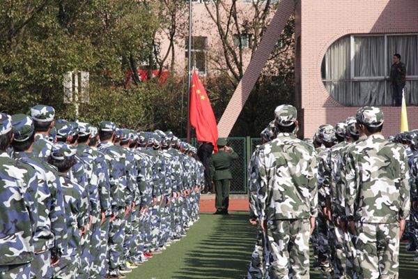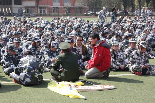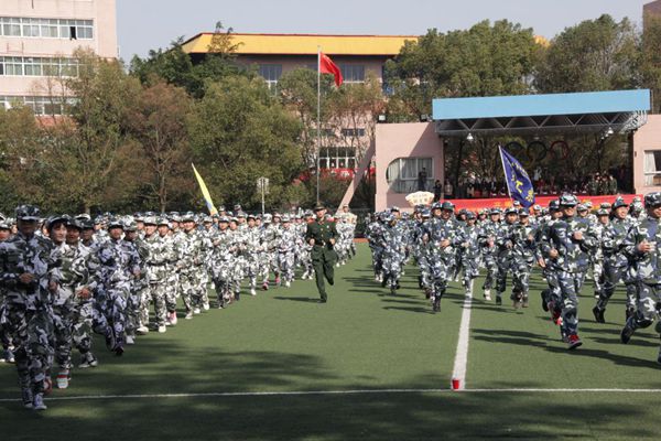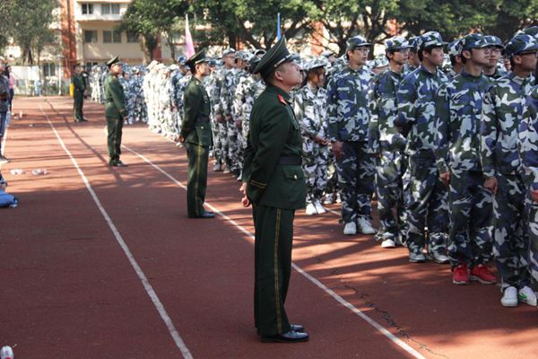 大会先举行升旗仪式,同学们整装而立,一片肃然,教官们向着红星红旗致以庄重的敬礼。仪式结束后,教官们带着同学们排成一字长队,以小跑的形式到规定的阅兵场地集合,组成方阵。