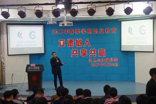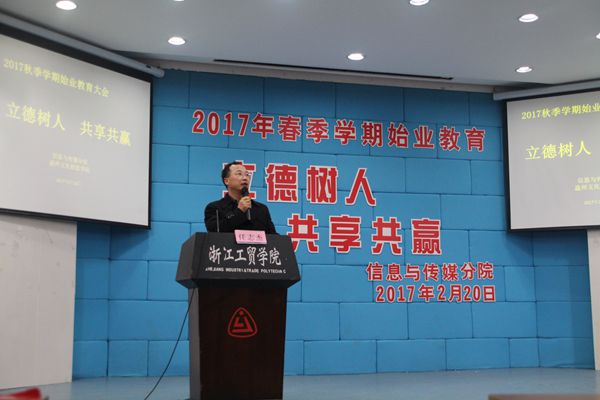 2017年2月20日17:30分,公司在阶梯教室举行了以 “立德树人,共享共赢”为主题的2017年春季学期始业教育大会。参加本次会议的领导有信息与传媒分院的任志杰书记、潘修强经理以及吴同喜副经理,公司全体员工参加了会议。
