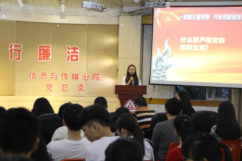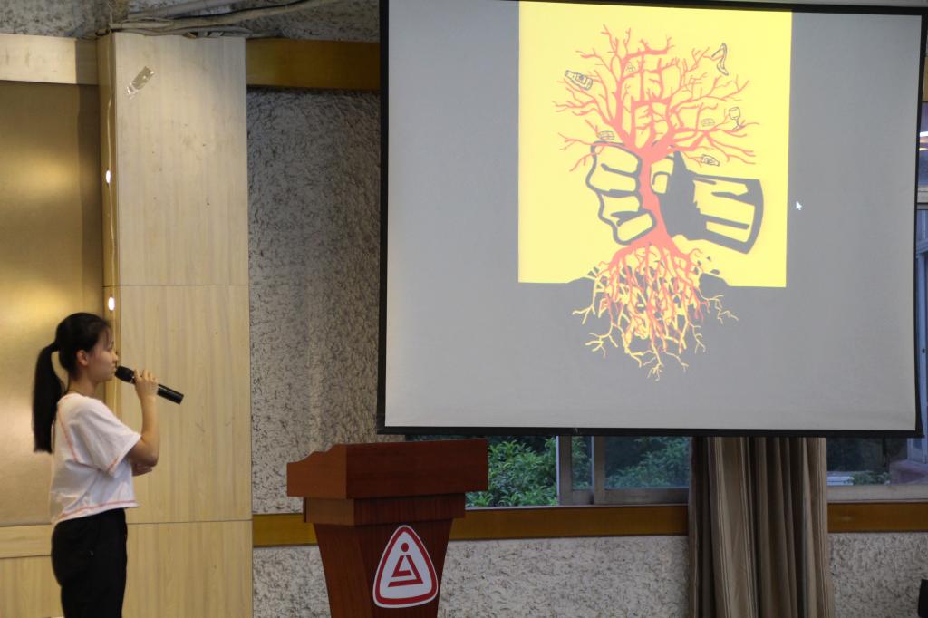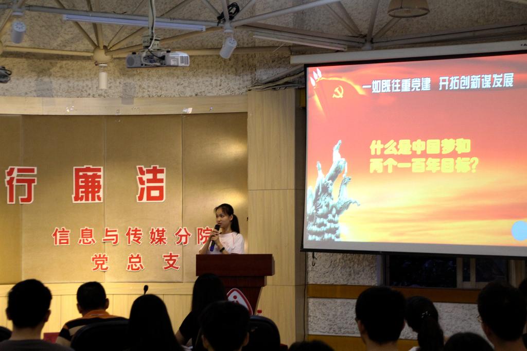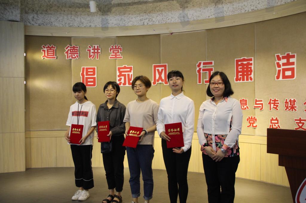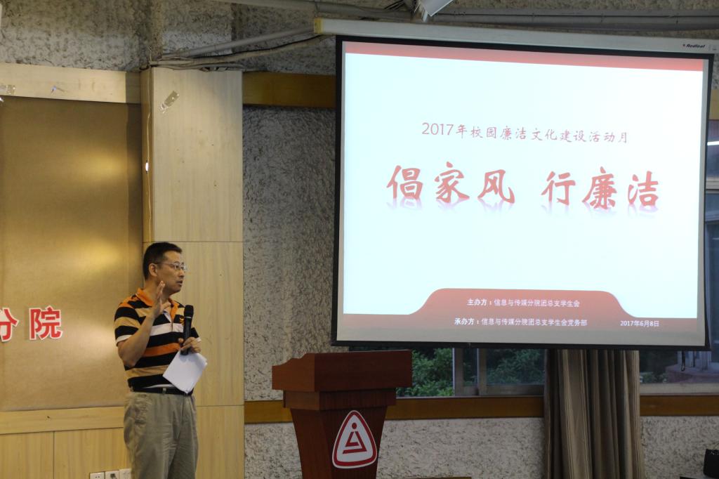 参加本次“倡家风·行廉洁”活动的老师分别有:信息与传媒分公司党总支书记任志杰老师、第一支部书记蒋斌老师、文创支部教师党员余好老师以及辅导员翁昭昱老师。活动分为四个流程:首先为在本次“倡家风·行廉洁” 廉政文化作品设计活动中获奖的优秀选手们颁奖,并由获一等奖得主动漫1502班的符曾玥同学为大家做作品介绍。然后由第一支部书记蒋斌老师为大家带来以“倡家风”为主题的演讲,蒋老师以多个家风典故为引,为同学们带来了如何提倡家风的精彩讲话。接下来开展了以“坚定信仰”为主题的15级拟转预备党员的入党答辩会,六位答辩人依次上台抽签回答相关答辩问题,答辩现场气氛紧张严肃,答辩人谨慎思考,对答如流,获得了在场同学们的阵阵掌声。最后由信息与传媒分公司党总支书记任志杰老师为本次活动做总结,任书记列举了多个典故家风家训,尤其是提到林则徐的“十无益”,与在场的各位老师同学共勉,书记的精彩总结也为“倡家风·行廉洁”道德讲堂活动画上了圆满句号。