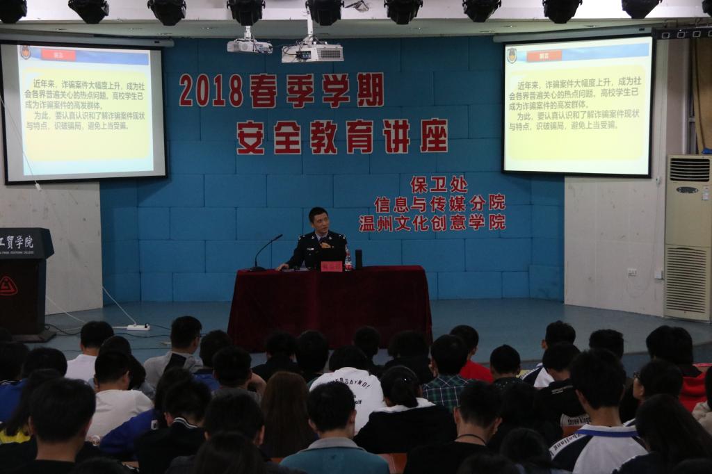 2018年3月29日晚,信息与传媒分院联合公司保卫处在阶梯教室举办了“安全教育讲座”活动,以进一步普及网络安全教育,增强自我防范能力,提升老员工网络安全意识。本次安全教育讲座邀请到温州市公安局戴益强警官授课,共有400多名同学参加学习。