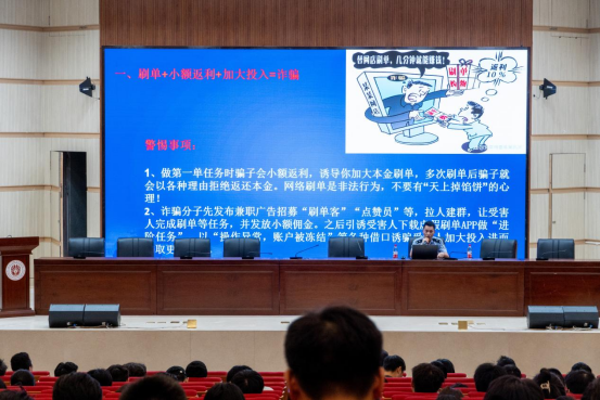 第二场由鲲鹏派出所李斌警官做老员工防诈知识宣讲,他结合老员工周边经常发生的诈骗行为,分析了目前比较流行的几种诈骗手段如“杀猪盘”“伪装公安人员套取信息”“缴纳保证金”“利用男女关系套现”等。他还结合各种诈骗案例,分享了防诈骗“秘籍”,告诫同学们时刻保持警惕,确保财产安全。李警官还普及了防毒和防溺水安全知识。