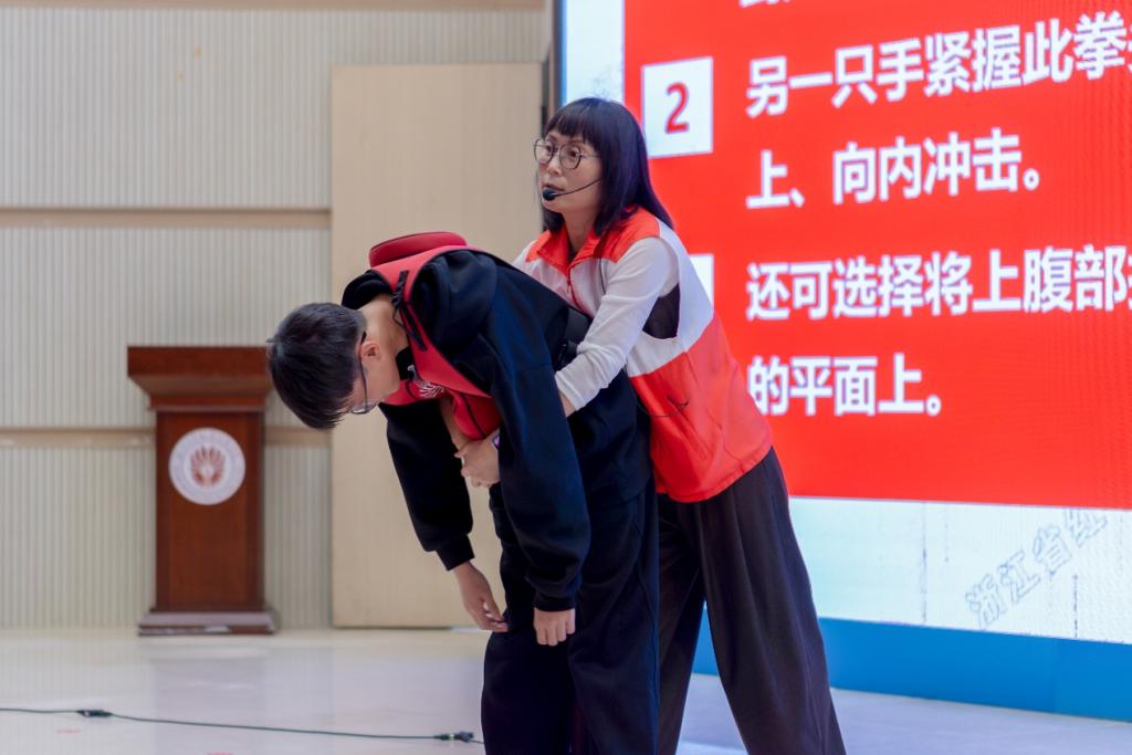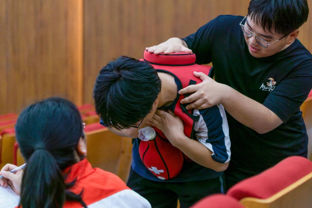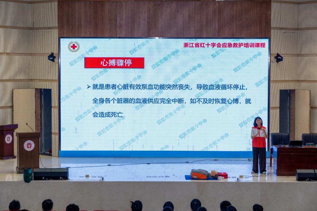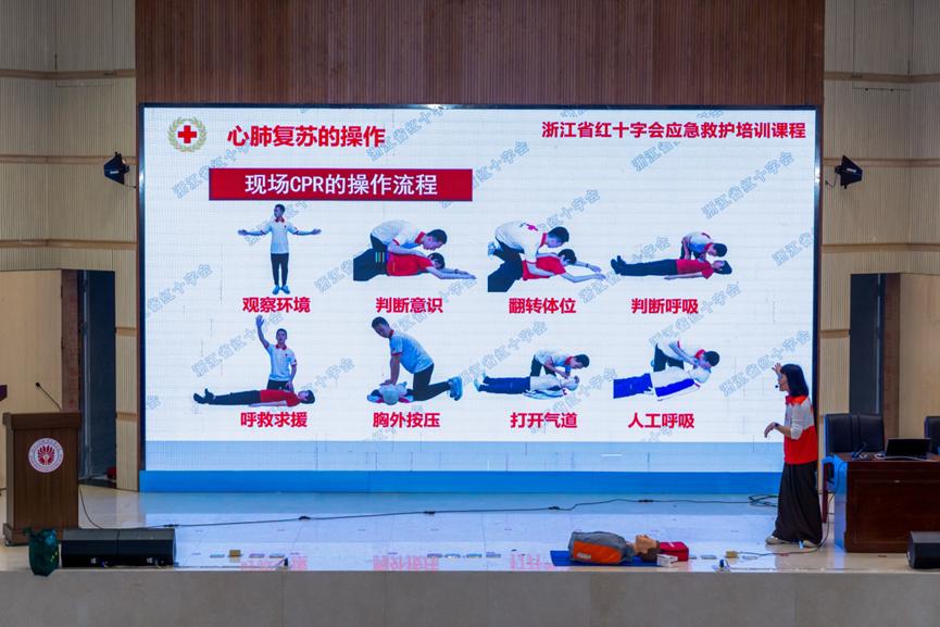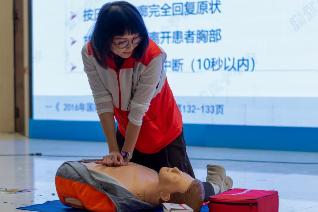 本次培训内容分为理论讲授、急救实操和实操考核3个环节。首先,国家二级救护员导师,叶君君老师为同学们讲解示范CPR(心肺复苏)的操作和AED(心脏除颤器)的使用。导师引入埃里克森在世界杯赛场突发心脏骤停的案例,让学员感受急救的重要与紧迫。事发当时,医疗人员迅速带AED 到达,队友筑起安全圈,在黄金 4 分钟内,埃里克森成功获救,该事件体现出医疗人员急救工作的及时和专业,成功挽回一个生命和家庭。