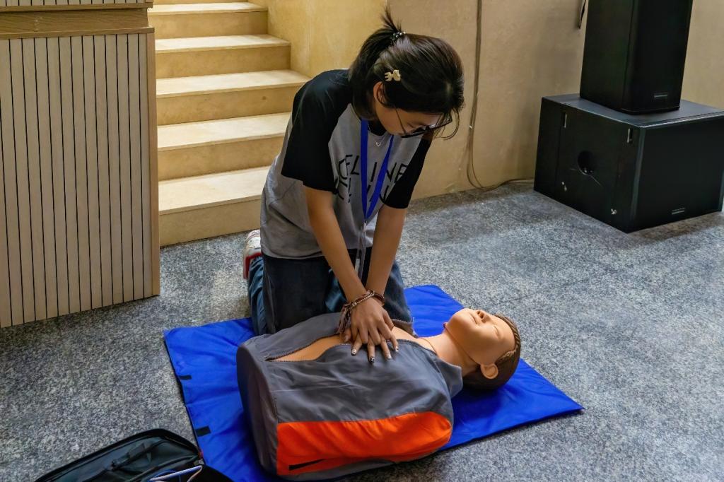 在急救实操环节,导师亲自示范操作心肺复苏(CPR)以及自动除颤器(AED)的正确步骤和方法。当面对有人突发心脏骤停的紧急情况时,首先要冷静且迅速地评估现场环境,确保环境足够安全,避免施救过程中出现二次伤害。随后,通过轻拍患者并大声呼喊的方式判断其是否存留意识。若患者失去意识,需立即翻转患者体位,再次仔细判断呼吸情况。一旦确定患者心脏骤停,周围人应立刻高声呼救,同时拨打 120 急救电话并准备自动除颤器(AED)。