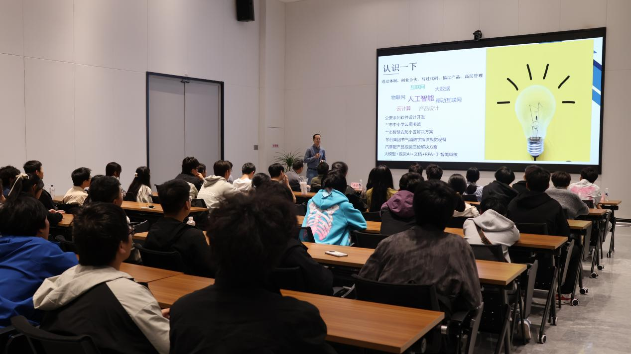接着,温州市软件行业协会副秘书长、AI专委会副主任、元贞科技创始人陈景钗给软件24级新生带来了一节以“探讨AI时代下学习的技术方向”为主题的认知实践课,课程从为什么学,怎么学,行业现状,中国人工智能产业规模,中国AIGC应用核心观点,传统工作被替代的可能性,产业人才岗位类型及能力要求等几方面详细介绍新时期的软件技术原理和应用,帮助软件24级新生全面深刻地理解软件技术专业。