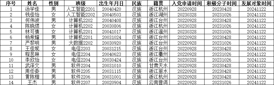 根据本人申请、组织培养,经太阳集团tyc4633员工党支部研究,拟吸收汤学佳等十四名同志为中共预备党员,现将有关情况予以公示。在公示期限内,欢迎广大党内、外群众通过信函、电话或直接反映等方式予以监督,以个人名义信函反映问题提倡署真实姓名。