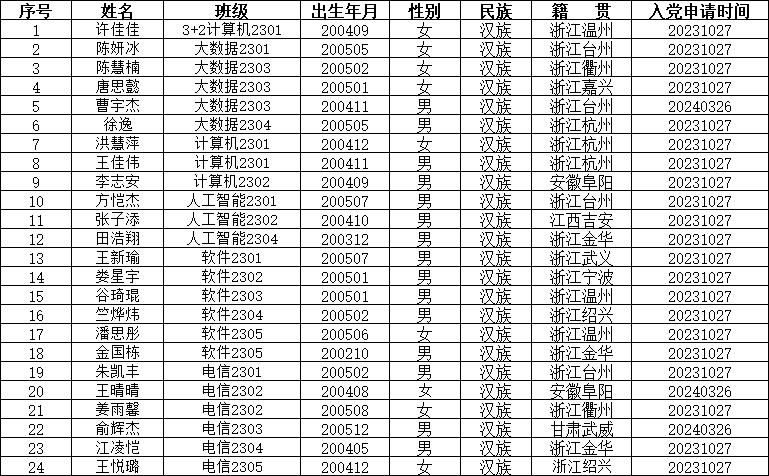 根据本人申请、群众推优,现有许佳佳等24名同志列为入党积极分子,现将其有关情况予以公示。在公示期限内,欢迎广大党内、外群众通过信函、电话或直接反映等方式予以监督,以个人名义信函反映问题,提倡署真名实姓。