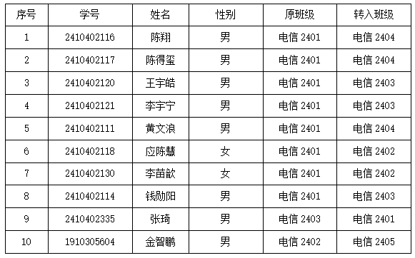 电子信息工程技术专业2024级班级调整员工名单(公示)