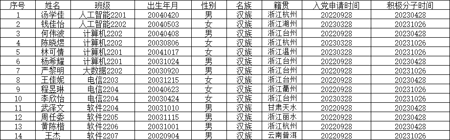 根据本人申请、组织培养,经党支部研究,拟将汤学佳等14名同志确定为发展对象,现将其有关情况予以公示。在公示期间内,欢迎广大党内外群众来信(署名)、来电、来反映问题。
