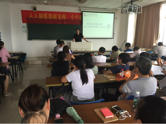 根据公司2017年秋季学期教职工专题培训要求,信息与传媒分院于9月8日下午13:30在6712教室开展全体教师学习讨论会。会议由分院副经理吴同喜主持,分院全体教师参加了此次会议。