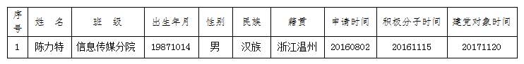 根据本人申请、组织培养,经研究,拟吸收陈力特同志为中共预备党员,现将其有关情况予以公示。在公示期限内,欢迎广大党内、外群众通过信函、电话或直接反映等方式予以监督,以个人名义信函反映问题,提倡署真名实姓。
