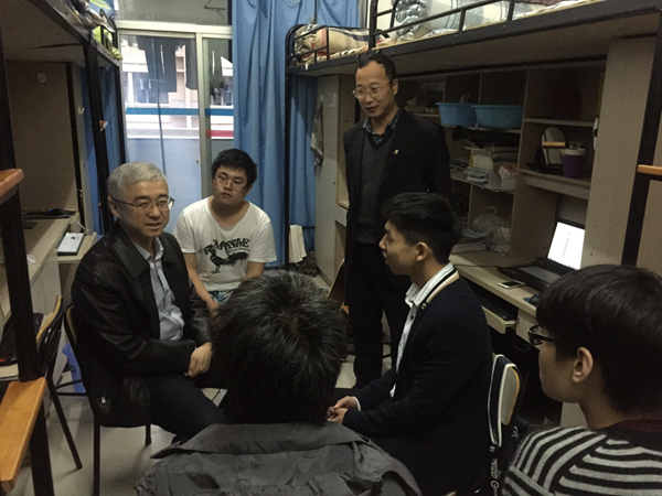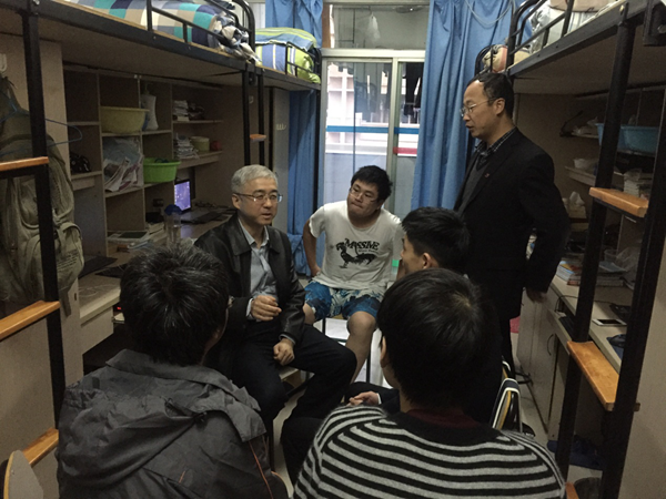 11月 30日傍晚,公司经理贺老师来到信息传媒公司F1幢722寝室看望员工,交流谈心。一到寝室门口,同学们赶紧从座位上起来,向经理和随行的老师问好,在同学们有礼的招待下,贺经理坐下来和同学们交流起来。贺经理逐一了解员工们的基本情况和学习状态,询问课余时间同学们的时间安排,同学们回答有浏览网页资讯的、有学吉他表演节目的、有参加刘基文化研读会的、有锻炼身体坚持跑步的。当得知通过半年的坚持跑步体重减轻六十斤后,贺经理大加赞扬,称赞同学有毅力,能坚持,有了之这份坚持和毅力,一定会在自己日后的员工工作中起到巨大的作用。贺经理也了解寝室成员中是否有宗教信仰的情况,并告诉同学们国家和公司对于宗教的政策,鼓励同学们讲科学的精神融入到学习中,锻炼成材,实现梦想。贺经理最后留下自己的电子邮箱,希望同学们多多和他联系,将对公司的建议、想法和情况写信交流,为公司的发展一起努力。同学们也希望贺经理多多来坐坐,与同学们交流谈心,也感谢公司领导能定期下寝室走访慰问。
