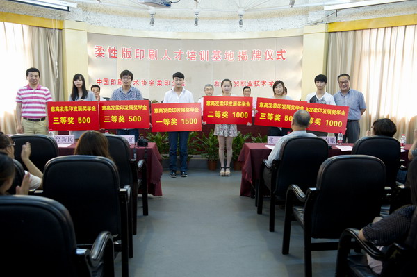 仪式中贺经理和周建宝所长共同为“柔性版印刷人才培训基地”揭牌,贺经理并为柔印分会副理事长陈爱庭颁发“柔性版印刷人才培训基地副主任”聘书。黄鼎楼副理事长、钱征副秘书长为公司印刷专业员工颁发“中国青州意高发柔印发展奖学金”。