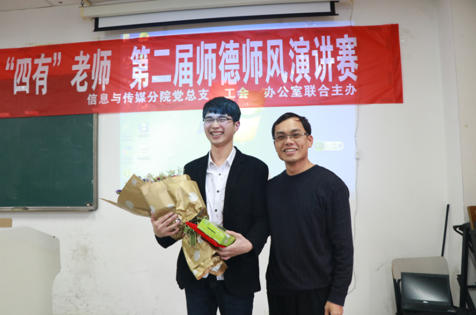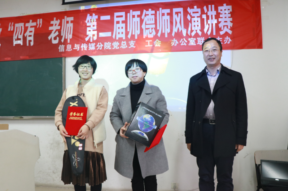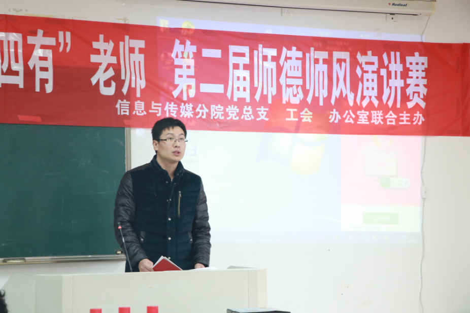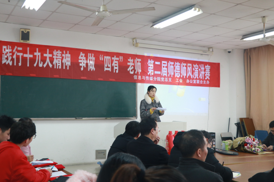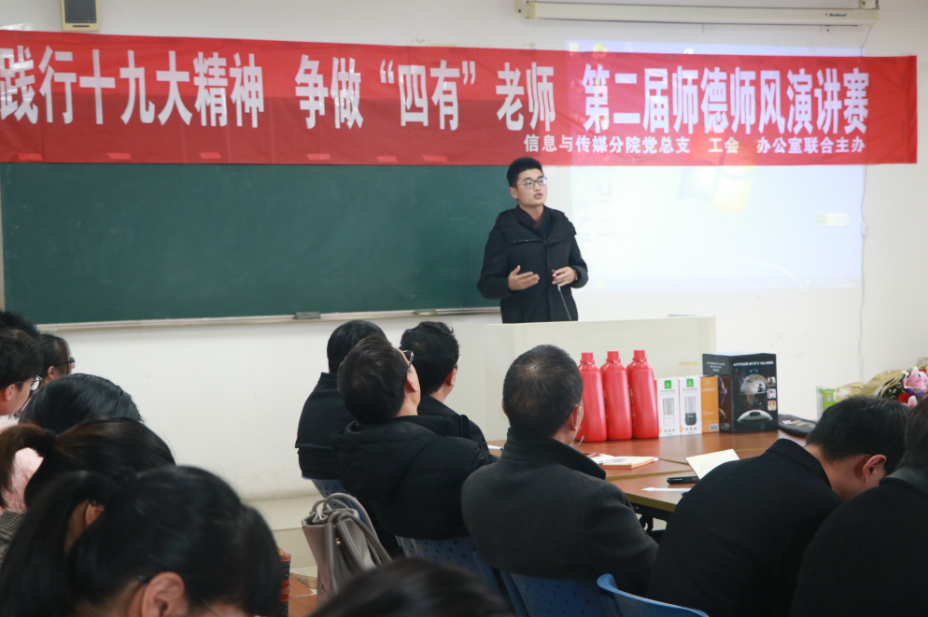 为践行十九大精神、争做新时代“四有”新老师,进一步加强师德师风建设,将立德树人工作落到具体的言行和教学之中,2017年12月29日下午,信息与传媒分公司党总支、工会、办公室联合举办“践行十九大精神 ,争做新时代四有好老师,第二届师德师风演讲赛”。信息与传媒分院全体教师参加了本次活动,来自不同办公室及专业教师团队的九位老师作为选手参加了本次演讲比赛。