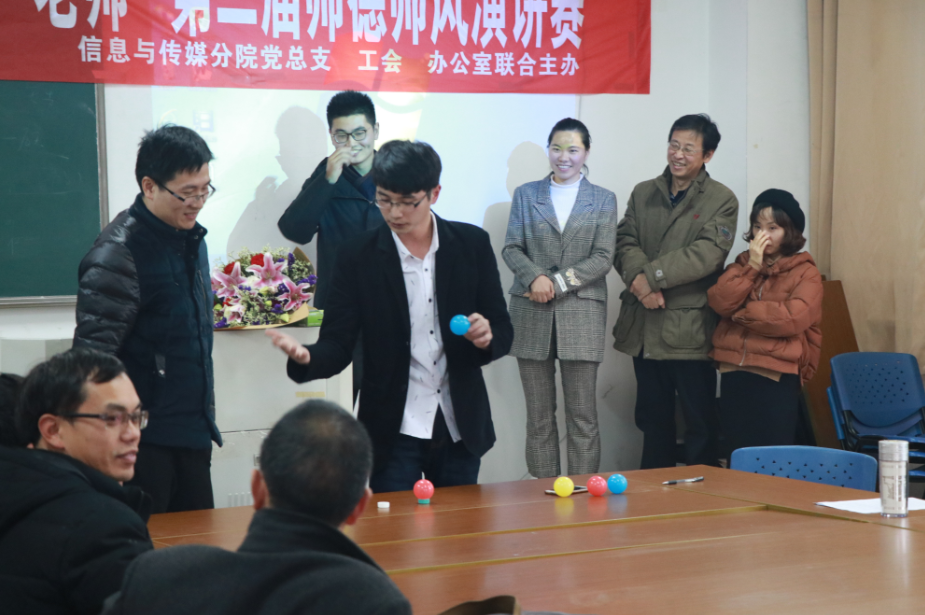 然后潘修强老师上台为这场比赛做了总结,他对现场气氛环境和选手现场表现给予了肯定。他强调教师是人类灵魂的工程师,应该发挥好榜样的作用,他鼓励各位老师在以后的工作中观察十九大精神,再接再厉、不忘初心,继续践行好师德师风,为推进优秀高职院建设做出贡献。最后,陈金波老师给大家表演了“心理暗示”的魔术,引起全场欢呼,惊讶声、掌声起此彼伏,为这场演讲比赛划上了完美的句号。