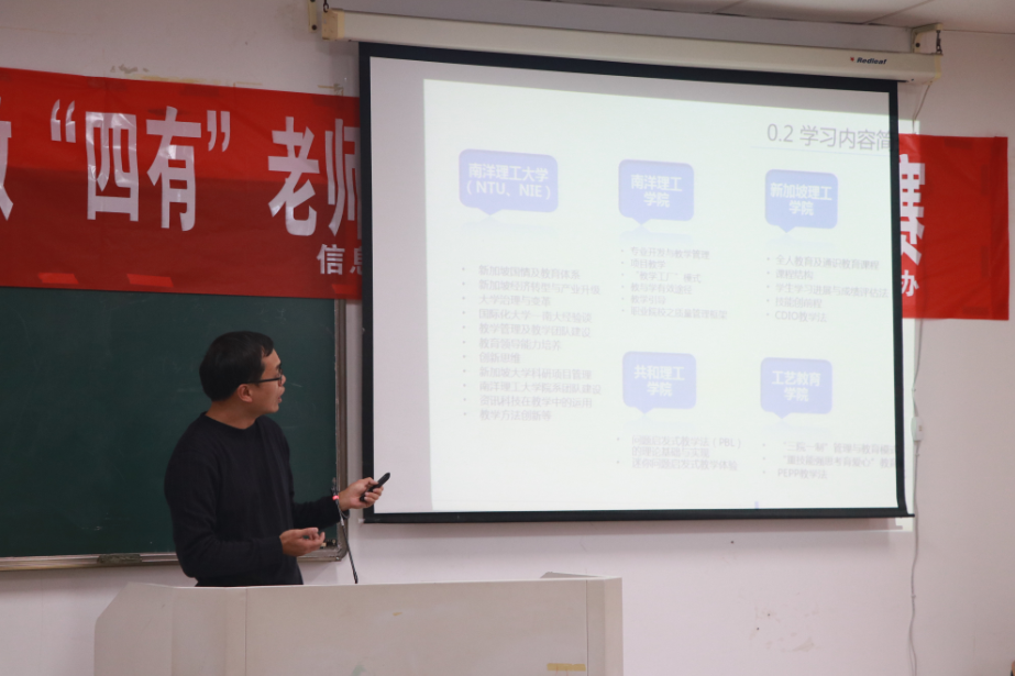 会议的第二项议程是潘修强老师做赴新加坡学习教育相关报告。报告主题是《教师角色与以员工为中心》。报告中潘老师结合新加坡学习提出了两个问题:一、为什么要进行信息化教学?二、老师的角色和功能在供给侧中发生了什么变化?对于这两个问题,潘老师结合在新加坡学习的见闻和自己的思考,现场用微信和老师交流问题。在互联网时代,老师所面对的是与以前不同的员工,在这个情况下,老师要紧跟变化,实时更新自己的储备及技术,在当下寻找自己的不足,并改进,技术、教学法和学科之间要进行整合,不能侧重单个或两个,必须三方整合。对于老师的角色和功能提供,潘老师认为,在未来,教师这个职业,在教书育人上更加要注重育人,培育员工健全的人格,发挥立德树人的功能。