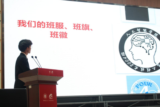 全体起立奏唱国歌,为我们拉开了活动序幕。赛程内容由班级建设展示、班级才艺展示和红歌献党三分部组成。班级建设展示部分,各个班级或以幻灯片或以短视频展现了入学以来的班级建设情况。班旗、班徽、班级口号展现了同学们创意十足的想法;青年团日活动,展示了同学们团体建设、志愿服务的蓬勃朝气;班级成员故事展示了生活掠影、点滴之美。