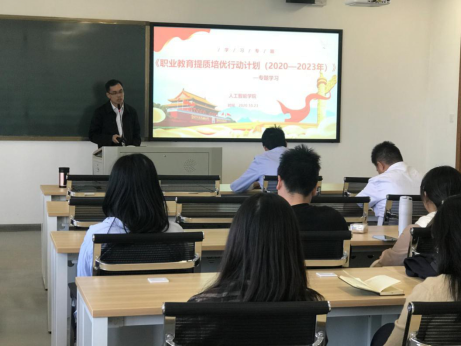 紧接着,分院经理潘修强老师带领大家集体学习教育部职业教育提质培优行动计划(2020—2023年)》文件精神,并对今年的毕业设计展和顶岗实习工作做了介绍和布置。对《职业教育提质培优行动计划(2020—2023年)》,他带领大家从总体要求、重点任务、组织实施等方面学习了《职业教育提质培优行动计划(2020—2023年)》文件精神,侧重对“立德树人”、“产教融合、校企合作”、“三教”改革等方面进行解读,要求大家会后进一步认真学习、深刻领会《行动计划》内涵;对于分院拟在2020年12月1日—6日开展的“智慧物联”毕业设计展活动,要求大家思想上高度统一到“双高公司”建设和人才培养质量提升上,并要求大家克服困难,积极准备,共同努力把此次活动圆满完成;同时,潘经理对本学期顶岗实习方面的情况以及后续的工作安排作了介绍和部署,并要求指导教师要按照公司流程按时完成工作。
