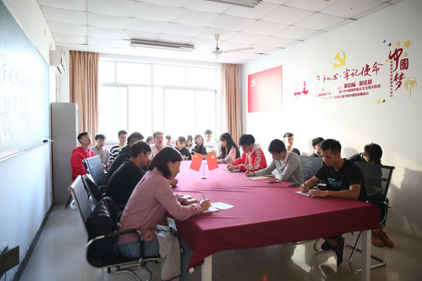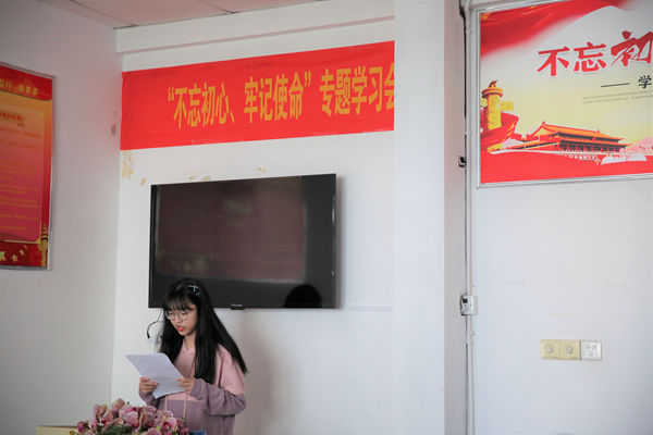 首先由18级的辛雯雯同学发言,她提出习总书记强调不忘初心,要求全体党员面对将来不忘过去,面对成绩不忘初衷,永远保持建党时中国共产党人的奋斗精神。我们现在所处的,是一个船到中流浪更急。人到半山路更陡的时候,是一个愈进愈难、愈进愈险而又不进见退、非进不可的时候。我们应该完善自身, 不断地完善自身,为实现中华民族伟大复兴而奋斗。