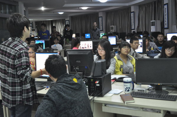 金秋十月,入夜已久,南昌东郊,一座写字楼内却灯火通明,一大群年青却在忙碌着。一张张稍带稚嫩脸,略带倦色,但却精神抖擞,干劲十足。CPU风扇的轰鸣声,鼠标点击声,以及低沉的讨论声,构成了一幅都市白领忙碌职场场景。这不是电视剧或电影的一个场景,也不是都市高档写字楼白领们工作场景,而是公司11级动漫专业员工在江西笛卡传媒有限公司顶岗实习的一幕。
