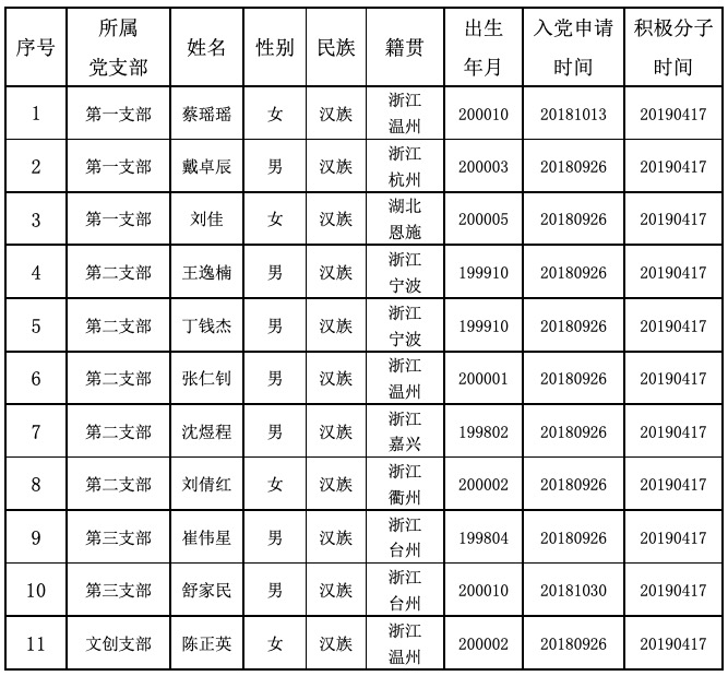 根据《中国共产党发展党员工作细则》有关规定,经信息与传媒分院第一党支部、第二党支部、第三党支部、文创党支部决议,拟将蔡瑶瑶等11人列为发展对象。现将其有关情况予以公示。如有异议,请向信息与传媒分公司党总支反映情况。