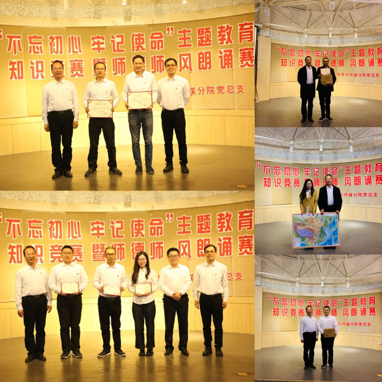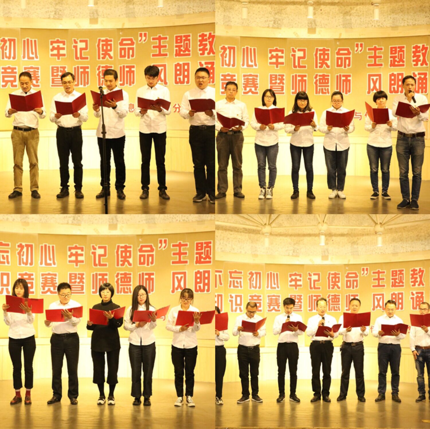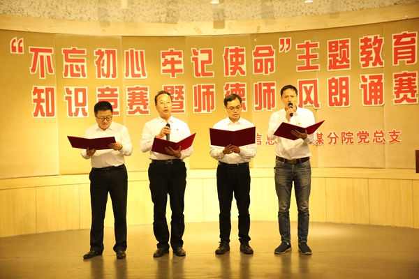 11月29日下午,信息分公司党总支在多功能厅举行“不忘初心、牢记使命”主题教育知识竞赛暨师德师风朗诵赛主题党日活动。本次活动分为两个部分,第一部分为“不忘初心、牢记使命”主题教育知识竞赛,由四个党支部组成的参赛队伍通过抢答“不忘初心,牢记使命”主题教育的相关题目和重要知识点,检验此次学习效果,根据得分情况评选出个人前三名和团队优胜奖,最后钱月钟、郭庆、陈力特、瞿小丹老师获得前三名,第二党支部获得优胜奖。 活动的第二部分是“不忘初心、牢记使命”师德师风朗诵赛主题党日活动,为了本次朗诵比赛,各党支部提前统一了服装,练习了曲目,按照抽签顺序,第一党支部为大家朗诵了《有一首歌》、第二党支部为大家朗诵了《祖国啊,我亲爱的祖国》、第三党支部为大家朗诵了《沁园春﹒长沙》和《忆秦娥﹒娄山关》,文创党支部为大家朗诵了《我的祖国》,信息分公司党总支委员会给大家朗诵了《祖国颂》和《为党放歌》。全体党员同志深情款款的朗诵,表达了对党和祖国的深情,也体现了新时期党员的形象,为进一步促进“不忘初心、牢记使命”主题教育往心里走起到了助推作用。