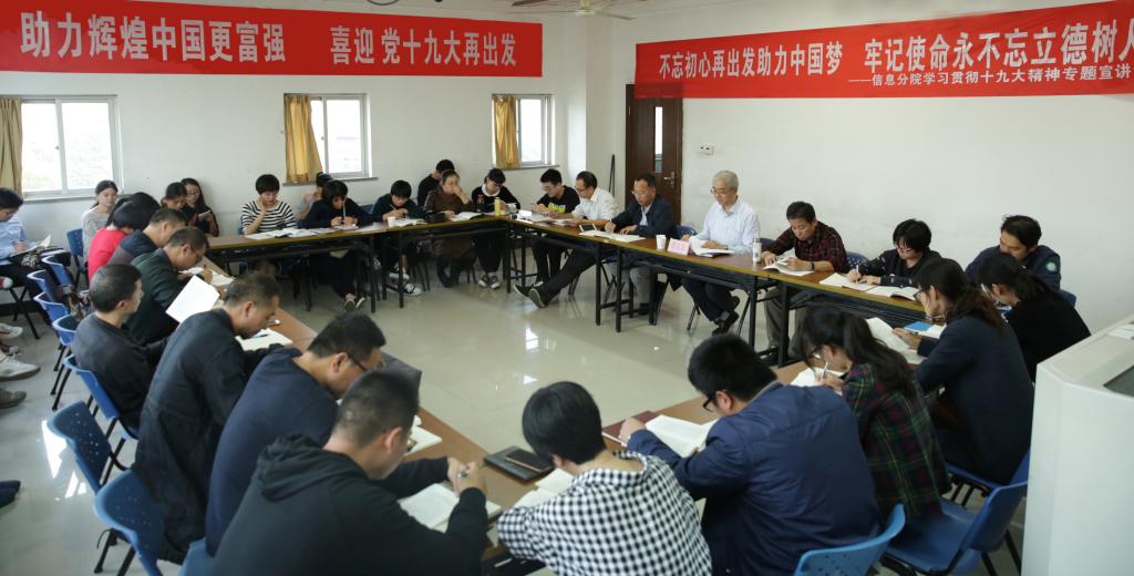 最后,贺经理提出三点要求:第一,各支部要认真学习十九大报告和新《党章》,原原本本的学,原汁原味的学,参考“人民日报”等中央媒体的社论进行学习。第二,要营造学习十九大报告的氛围,从教师到员工、从党员到群众、从党内到党外、从课堂到宿舍都要掀起学习十九大报告的热情,将十九大报告学深学透。第三,希望要学以致用,最基本的是把十九大报告的精神融入到立德树人和社会主义核心价值观教育上,搞好教学和员工工作,关心专业发展,将全部精力放在培养社会主义接班人上面来,为实现中国梦助力加油!