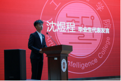 软件1803沈煜程同学作为毕业生代表发言,他结合自己的退伍、复学、专升本经历,以“感恩” “奋斗”“展望”为主题表达了自己对母校对老师的深深眷恋、无限感恩和对未来的信心。随后,带着感恩和祝福,毕业生代表自发为校领导、班主任们献上了鲜花。