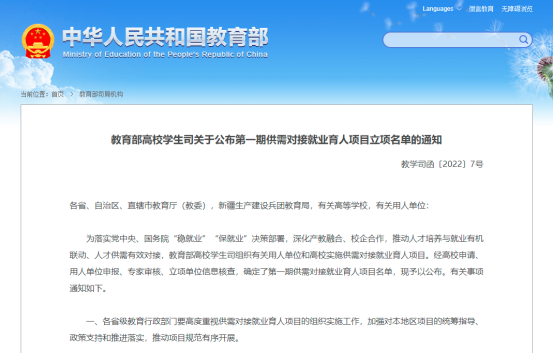 近日,教育部发布了《教育部高校员工司关于公布第一期供需对接就业育人项目立项名单的通知》(教学司函〔2022〕7号),浙工贸太阳集团tyc4633申报的2个供需对接就业育人项目获批,均是人力资源提升项目。
