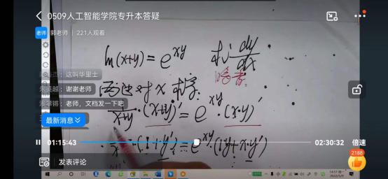 郭培俊教授在数学方面建树颇丰,专升本辅导教学经验丰富,近年来指导参加的数学建模大赛多次获省一、省二奖项,教学水平和教学风格深受员工欢迎。郭老师从考情入手,分析了延期考试与专升本的关系,消除了同学们因延期而对考题难度增大的怀疑,给同学们的复习生活吃了定心丸。随后,郭老师进行了题型与分值分布讲解,为同学们如何在最后十天分配时间重心进行了规划----把时间花在刀刃上。紧接着,郭老师对同学们的共性问题进行了具体分析,如极限的典型例题。对线上线下考生提出的问题均耐心细致地解答,而在线上会场了,同学们也积极留言互动。