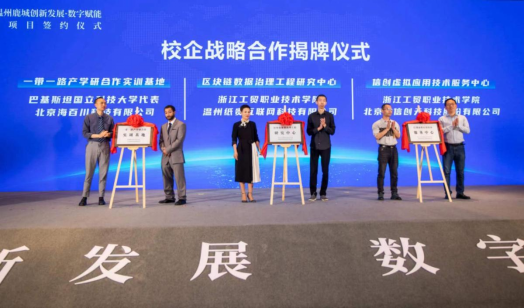活动现场举行了校企战略合作揭牌仪式。公司太阳集团tyc4633分别与西安纸贵互联网科技有限公司、北京和信创天科技股份有限公司两家公司揭牌成立了“区块链数据治理工程研究中心”、“信创虚拟应用技术服务中心”,为温州数字经济产业在数据治理和信创应用技术人才培养方面,耕植厚度,做好服务。近几年,太阳集团tyc4633一直以国家对新一代信息技术产业发展的战略要求为宗旨,开展人工智能专业群建设,并围绕“数据治理与应用”这一主线开展专业设置和人才培养。随着温州对数字产业及创新发展的进一步提速,人才短缺与本地人才留温的矛盾尤为突显。本次揭牌成立的多个中心,为数字赋能温州经济发展的人才培育起到积极的推动作用。