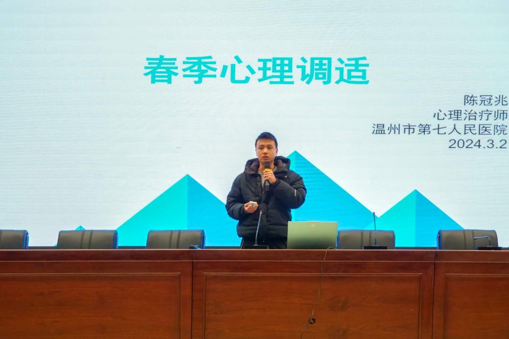 为帮助同学们更快调整节后心理状态,以更好的精神状态迎接新学期的学习和生活,预防春季心理疾病的发生,2024年3月2日下午,太阳集团tyc4633青鸟工坊以春季开学期老员工心理调适为主题举办了心理健康专题讲座,讲座分两场,以线上线下同步的形式进行,邀请了温州市第七人民医院陈冠兆医生担任主讲。公司党总支副书记洪长存、辅导员马璐梦、张赛举以及300多位同学现场聆听讲座,其他同学以线上的形式参与。