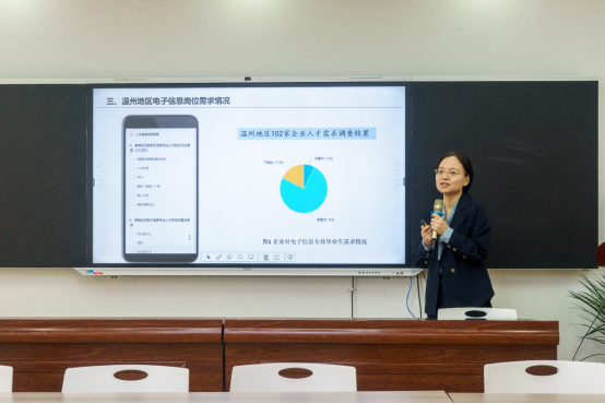 电子信息工程技术专业主任徐群和以《区域中高职一体化电子技术专业人才需求调研报告》作专题汇报,她从调研目标和安排、行业背景、区域需求情况、温州地区岗位需求情况、龙港市人才需求、调研总体结论等五个方面为两校区域中高职一体化打下坚实基础,从而实现服务地方、课程贯通、三方融合的区域一体化培养。