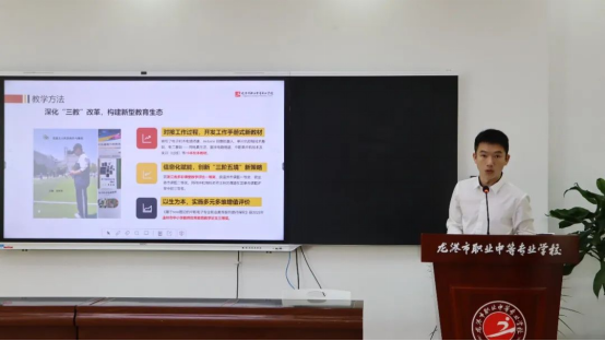 龙港职专智能制造学部副主任董大鑫老师从人才培养建设、课程实施建设、现阶段实施效果等几个方面开展汇报,围绕培养目标、培养模式、课程体系等对公司人才培养方案予以解读,同时表达了希望进一步对标区域产业发展前沿,建设完善实践教学、社会培训、真实生产和技术服务功能为一体的开放区域产教融合实践中心的美好愿景。
