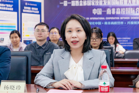 会上,杨晓珍副董事长代表公司向莅临本次会议的各位领导、专家、同仁表示热烈的欢迎并致以最亲切的问候和最衷心的祝福。她表示,公司一直积极对接数字强国战略及区域产业人才培养需求,并全力推进在大数据和人工智能领域的国际化协同育人,积极扩大优质职教资源辐射面,建设与国际接轨的课程及教学体系,培养具有国际视野的团队队伍和技术技能人才,整合各方科技、智力等资源,与走出去企业共建海外科研机构和文化传播基地,产生具有应用价值和社会影响力的科研成果。在共建“一带一路”和中非合作论坛框架下,公司愿携手多方在教育领域开展交流与合作,推动教育国际化和人才国际化。最后,杨晓珍副董事长诚挚邀请本次与会的所有南非高校来公司开展进一步国际交流与合作,共同参与“一带一路”国际合作项目,深化国际产学研合作,共同助力高水平教育对外开放。