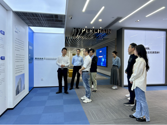 在访问过程中,趣链科技张总一行亲自带领大家参观了公司的展厅,并对公司在区块链技术领域的最新研发成果和应用案例进行了详尽的讲解。