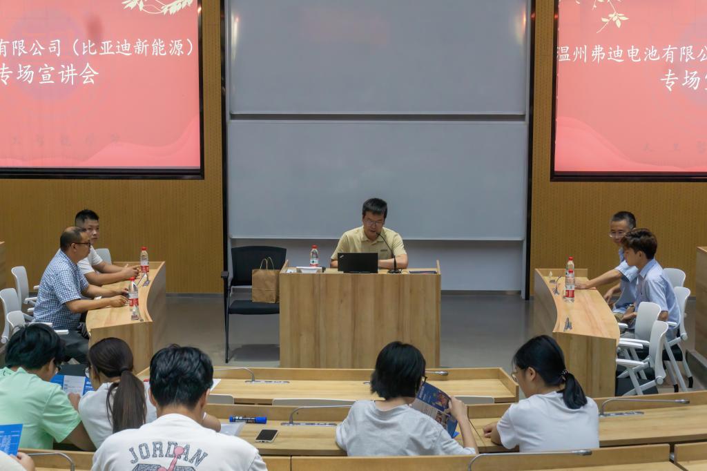 温州弗迪电池有限公司副总经理张瑷为大家向介绍公司情况。温州弗迪电池有限公司隶属于比亚迪集团,主要从事动力电池的研发与制造,具备完整的电池产业链布局。主营产品为刀片电池,具备顶级的工艺设计与前沿的生产技术,在电池、容量与安全性方面有良好保障。其研发的动力电池其技术水平已全球领先,并在市场占有率上处于全球头部。张瑷详细介绍了实习岗位的要求以及实习期间的工作安排,对工作待遇及未来发展和职级晋升等做了详细介绍。宣讲会现场设立了专门的简历投递与面试交流区,毕业生积极报名并参加了面试。