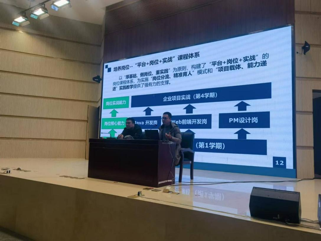 随后,大会详细介绍了专业岗位分流的精准育人模式,包括方向分流、班级重组、岗位自愿填报以及编程水平测试等环节,旨在帮助员工根据个人兴趣、学习潜能和岗位需求,选择最适合自己的成长路径。同时,大会还展示了“平台+岗位+实战”的课程体系,该体系遵循“厚基础、侧岗位、重实践”的原则,为员工提供了从专业群平台课程到企业项目实战的全方位学习体验,助力员工在实践中提升岗位通用能力、核心能力及实战能力。
