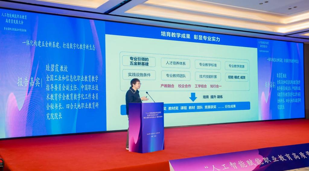 此外,全国工业和信息化职业公司产品指导委员会副主任眭碧霞教授围绕“一体化构建五金新基建,打造数字化教学新生态”的主题,阐述了数字化转型在职业教育中的关键作用及实施路径。