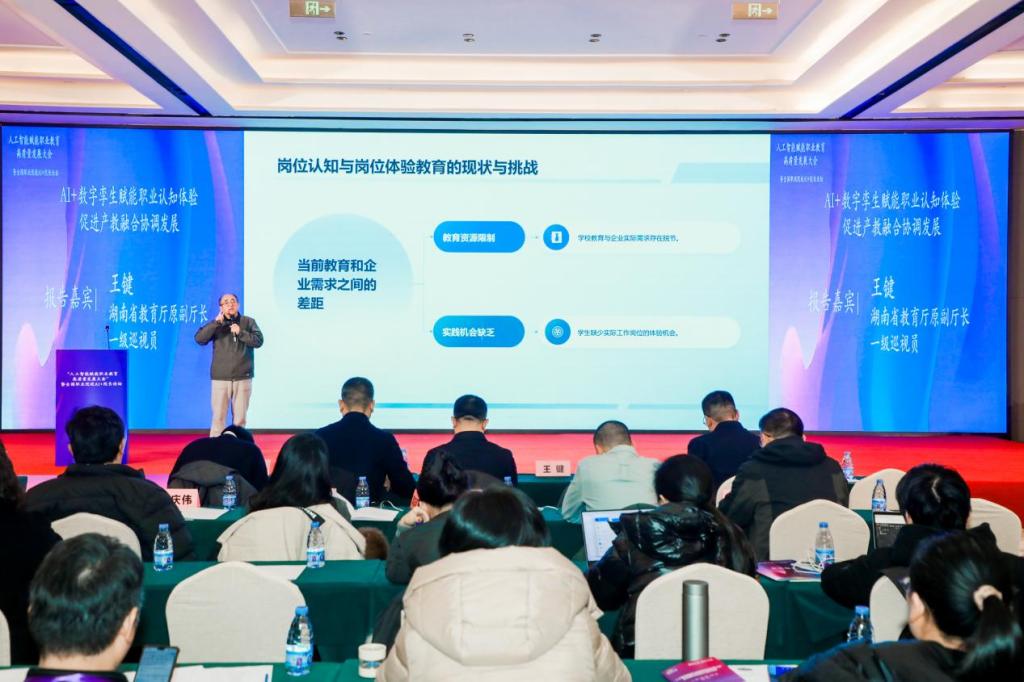 湖南省教育厅原副厅长王键教授以“AI+数字孪生赋能职业认知体验”为主题,深入探讨了人工智能技术如何助力职业认知体验的提升,促进产教融合协同发展。汪焰副董事长则结合公司近年来在AI+职业教育领域的积极探索与实践经验,从构建AI智慧教育平台、利用AI技术促进教师专业成长与能力提升等方面分享了公司在AI+职业教育领域的成功案例,为与会者提供了宝贵的借鉴与启示。同时,他鼓励大家积极探索、勇于创新,共同推动职业教育与AI技术的深度融合,为培养更多适应未来社会需求的高素质技术技能型人才贡献力量。