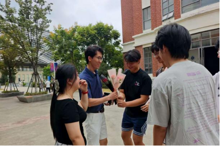 中午时分,同学们在教师就餐必经之路设置了“鲜花赠予点”,为过往的教师和公司领导献上鲜花与祝福。许多老师在惊喜之余,也纷纷表达了对同学们暖心举动的感谢。一束鲜花,一声问候,凝聚着学子对老师辛勤付出的认可与敬意,现场气氛温馨而感人。