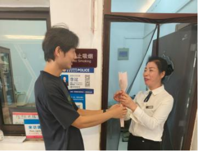 在致敬教师的同时,同学们也没有忘记校园里另一群“守护者”—— 宿管阿姨。同学们特意来到员工公寓,为每一位宿管阿姨送上鲜花和祝福。"阿姨辛苦了,谢谢您一直以来的照顾!"同学们真诚地道谢,让宿管阿姨们既惊喜又感动。