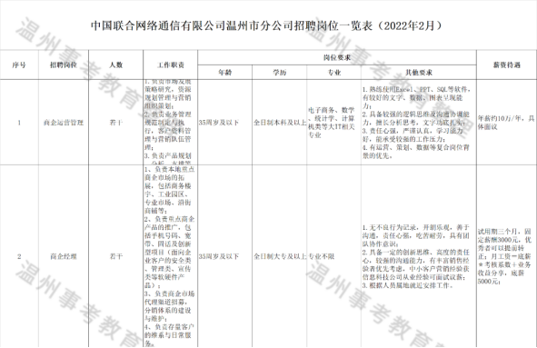 招聘岗位及要求详见《中国联合网络通信有限公司温州市分公司招聘岗位一览表》(2022年2月)(附件1)