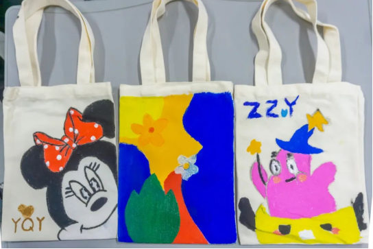 活动共分为设计和展示两个环节,在设计环节,选手们按照兴趣和特长对帆布包进行绘画创作;在展示环节,选手们将设计好的作品平铺在展示台上比拼创意成果。