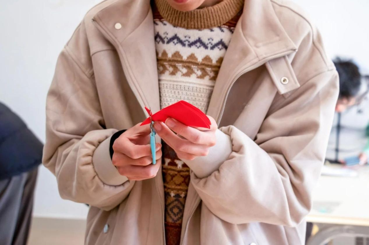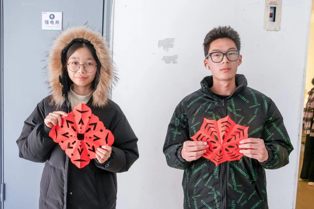 而剪纸区域更是热闹非凡,一张张红纸在大家的巧手下变成了精美的艺术品。同学们现场展示了高超的剪纸技艺,他们手中的剪刀如行云流水般在纸上穿梭,不一会儿,一些精美的图案就出现在了大家眼前。参与者们纷纷围拢过来,认真学习剪纸技巧,剪出了喜庆的窗花,大家互相展示着自己的作品,脸上洋溢着幸福的笑容。