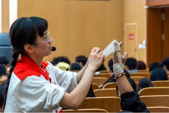 下午是救护员考核,是对大家救护技能的评估与检验,也是成为红十字救护员的关键一步。参加考核的同学早早吃完午饭在报告厅中练习考核内容,在红十字会的老师们的协助下,大家顺利完成了此轮培训。